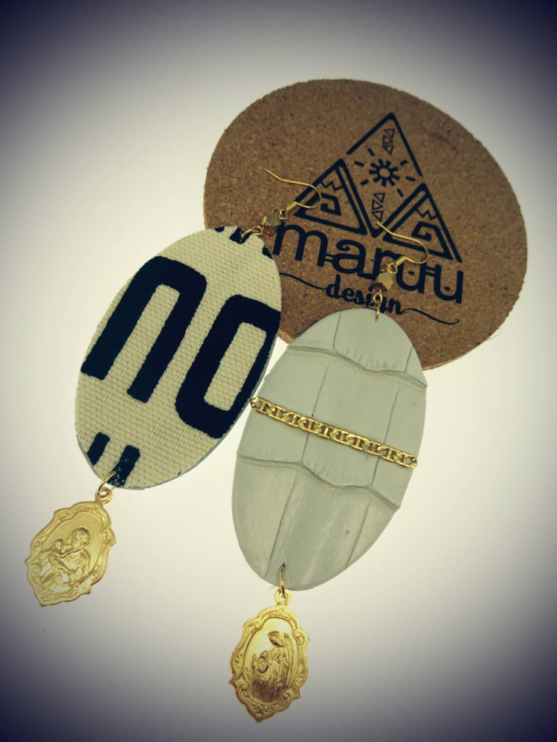 【Handmade】白クロコダイルレザーピアス不思議のメダイ付き